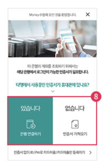 머니수첩 서비스를 이용하려면 '하나원큐기업'앱을 설치하신 후, 순서대로 진행해 주세요.